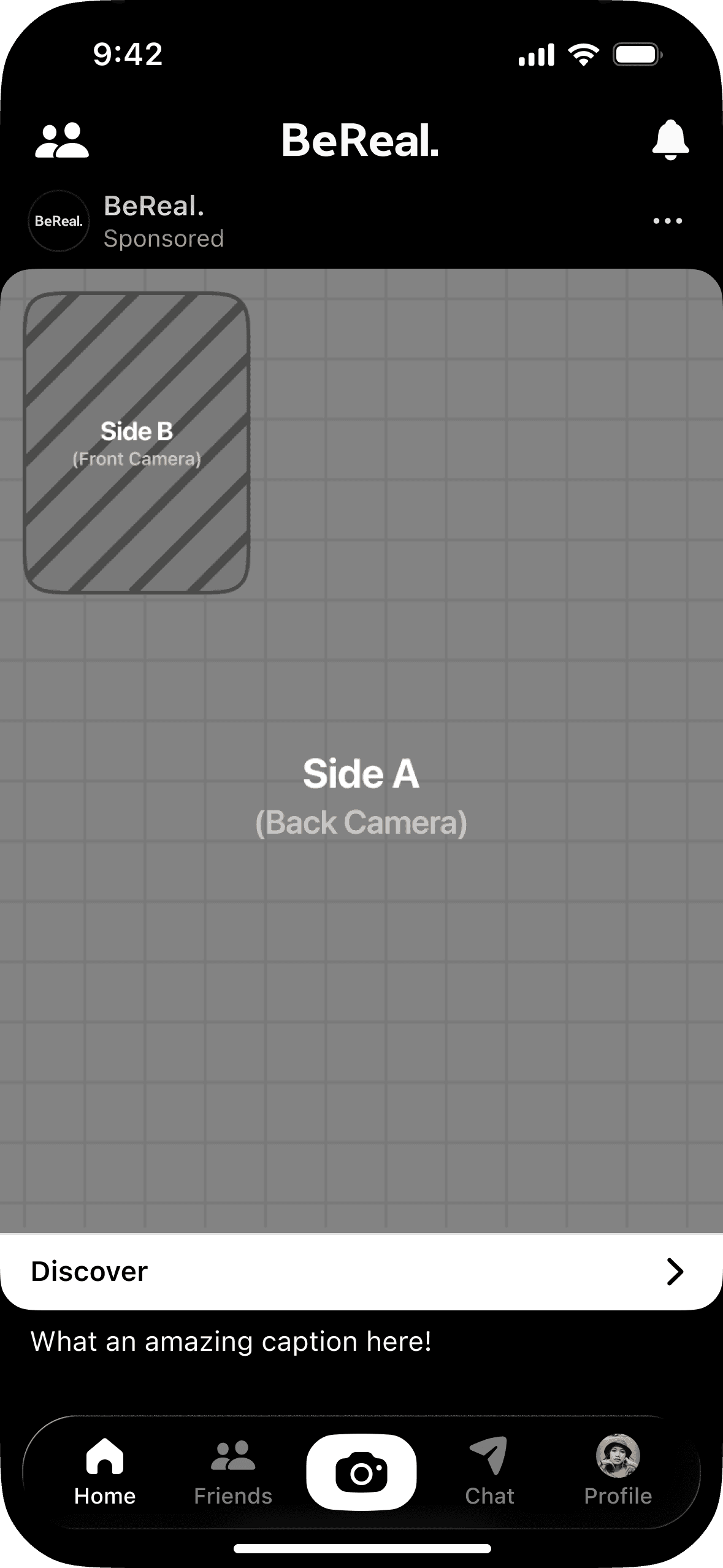 Ads on BeReal should follow the same constraints as organic content. Respect the dual front-and-back camera format and avoid adding text overlays or graphic elements that disrupt the native experience.